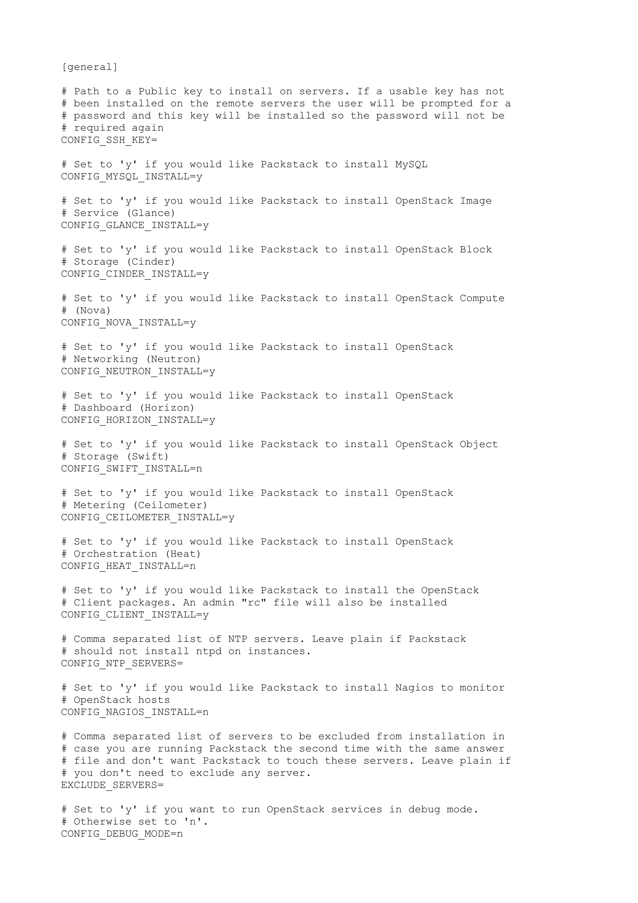 The document is a configuration file for installing various OpenStack components using the Packstack tool, detailing options such as enabling MySQL, setting up OpenStack image, compute, storage services, and network configuration. It includes parameters for different services, IP addresses, authentication credentials, and installation preferences for components such as Nova, Neutron, Cinder, Glance, and more. Additionally, it specifies options for setting up SSL, enabling debugging, and configuring various network interfaces.