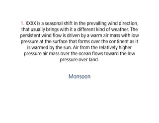 The document discusses various geographical terms and features. It begins by defining monsoon as a seasonal shift in wind direction that brings different weather when a warm air mass forms over a heated continent. It also defines El Nino and La Nina in relation to warming and cooling of surface waters in the Eastern Pacific. The Tropics of Cancer and Capricorn are described as the lines where the sun is directly overhead at noon on the summer and winter solstices in the Northern and Southern Hemispheres. Several other terms are defined such as peninsula, isthmus, trade winds, alluvial soil, and features like the Deccan Plateau, Brahmaputra River, Coromandel Coast, and Kosi