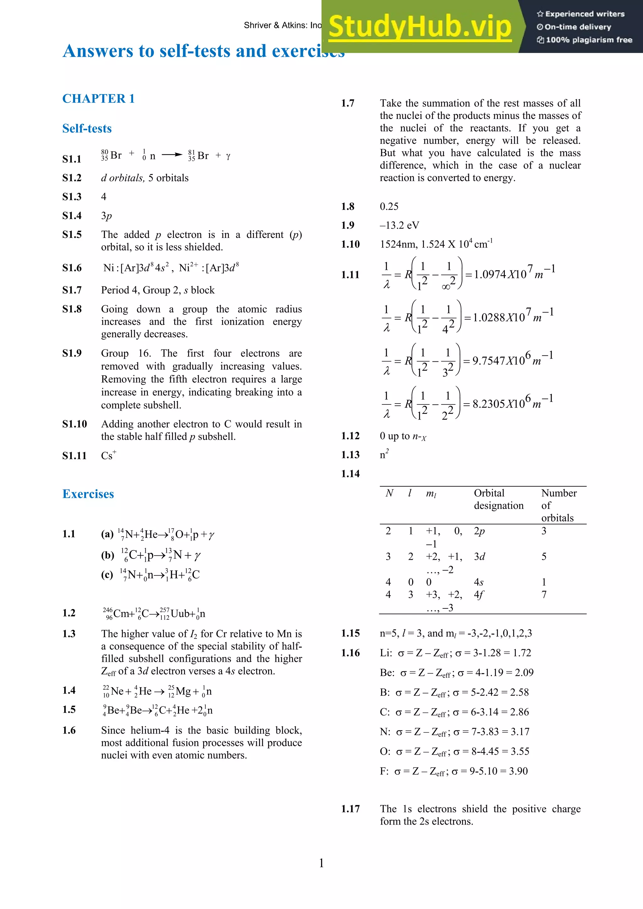 This document provides answers to self-tests and exercises from chapters 1-4 of an inorganic chemistry textbook.