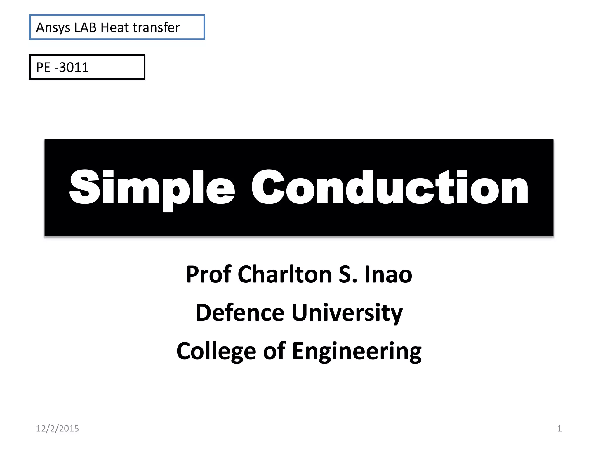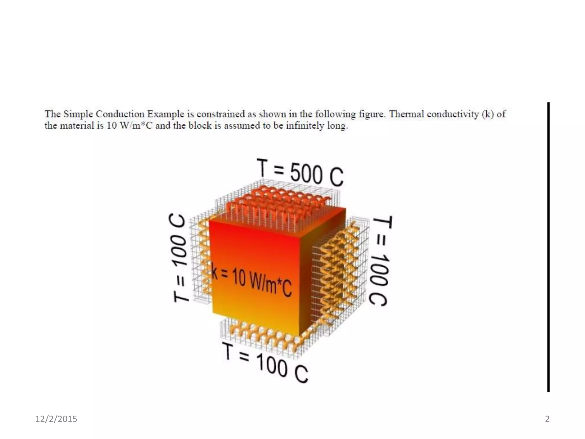 This document describes a simple conduction problem analyzed using ANSYS. A 1x1 square area made of a material with thermal conductivity of 10 is meshed and boundary conditions of 500°C on top and 100°C on other sides are applied. The steady-state thermal analysis is solved to give a contour plot showing maximum temperature of 500°C at the top decreasing to 100°C at other boundaries. Corner nodes are noted to show some limitation due to overwriting of constraints.