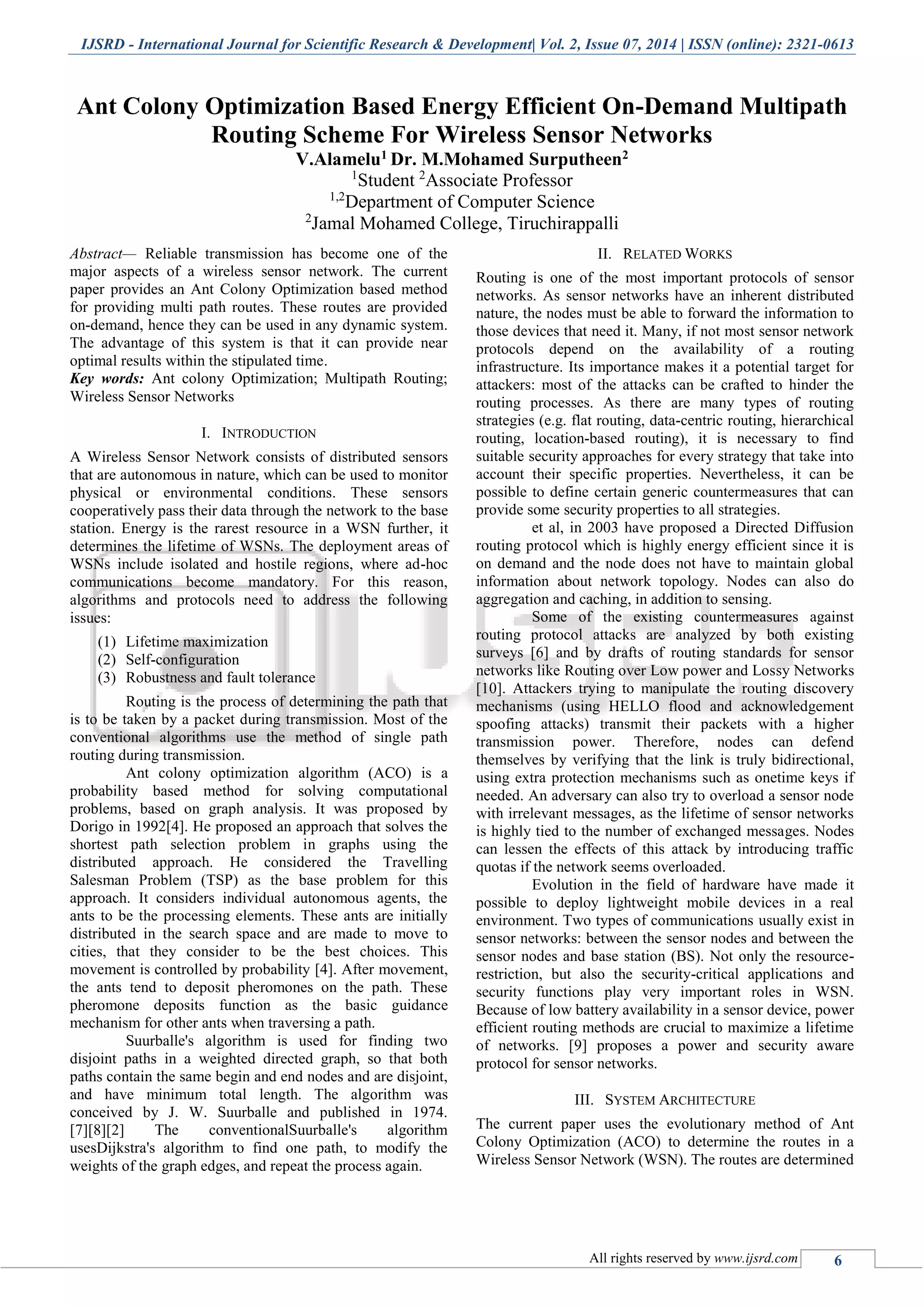 The document presents an ant colony optimization (ACO) based method for energy-efficient, on-demand multipath routing in wireless sensor networks (WSNs). It outlines the dynamic nature of WSNs and how the proposed routing scheme aims to maximize network lifetime by determining optimal paths based on real-time topology analysis. The method demonstrates flexibility for both dynamic and static environments and suggests potential future enhancements, including route reuse.
