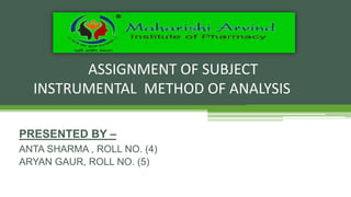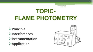 Flame photometry is a technique used to analyze sodium, potassium, lithium, calcium, and barium concentrations in solutions. It works by nebulizing a liquid sample into a flame, which excites the metal atoms. As the atoms return to the ground state, they emit light at characteristic wavelengths. A monochromator separates this light, which is measured with a detector. The light intensity is directly proportional to the metal's concentration. Interferences can occur from spectral overlap, ionization, or chemical reactions with other sample components. Applications include analyzing foods, beverages, pharmaceuticals, and more. Quantitative analysis is performed using calibration curves or standard addition methods.