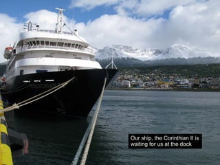 Our ship, the Corinthian II, took passengers on a Antarctic expedition from December 22, 2008 to January 1, 2009, making various stops along the way. Highlights included seeing hundreds of thousands of penguins at their rookeries, spectacular ice formations, climbing volcanic islands, and celebrating Christmas at sea, but the trip ended in tragedy when a 65-year-old passenger died in the hospital after becoming unconscious on the return trip to Ushuaia, Argentina.