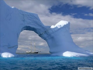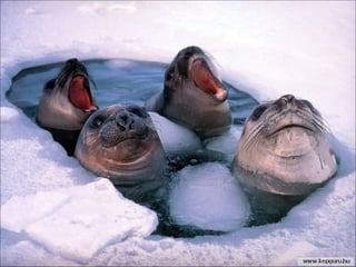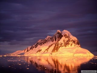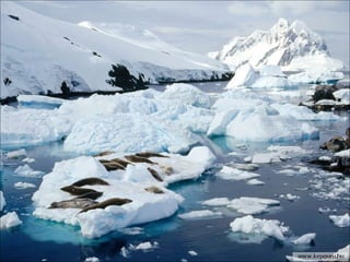 Antarctica is Earth's southernmost continent located in the Antarctic region, almost entirely south of the Antarctic Circle. About 98% of Antarctica is covered by ice averaging at least 1.6 kilometers thick, making it the coldest, driest, and windiest continent. While there are no permanent human residents, around 1,000-5,000 people reside at research stations across the continent year-round. Only cold-adapted plants and animals like penguins, seals and mosses survive in Antarctica.