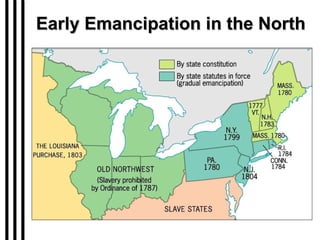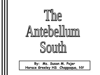 The document provides an overview of antebellum southern society and the institution of slavery. It describes the southern economy as primarily based on agriculture, especially cotton production, with slavery as the main labor force. It discusses the demographics of the south, which had a population that was 40% enslaved black people. The summary also characterizes southern slavery as a "peculiar institution" and notes that slave resistance took various forms including sabotage, escape, and occasional rebellions.