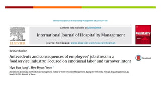1) The document discusses a study on the antecedents (emotional labor) and consequences (turnover intent) of job stress in the foodservice industry, with emotional dissonance and job stress as mediating factors.