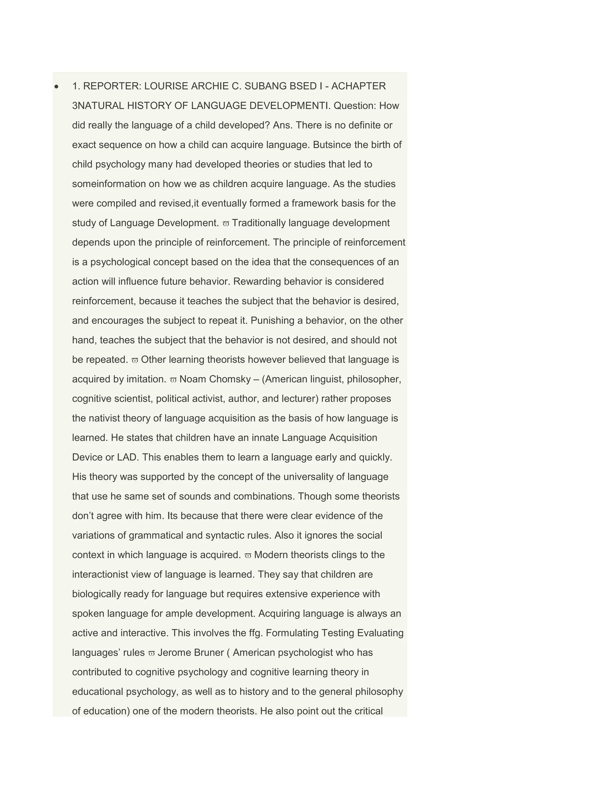 1. The document discusses the development of language in children. It describes several theories of how language is acquired, including reinforcement, imitation, and Chomsky's nativist theory of an innate language acquisition device.