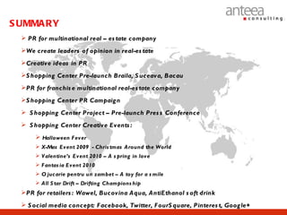 The document outlines a comprehensive PR and events strategy for real estate companies and shopping centers, highlighting successful campaigns executed from 2008 to 2012. Key elements include launching shopping centers in various locations, media relations, and social media strategies, with notable case studies reflecting extensive press coverage and increased brand awareness. The campaigns included creative events for holidays and promotional activities, resulting in significant visitor engagement and media presence.
