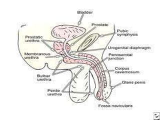 The document describes the anatomy and radiographic evaluation of the urethra. It discusses the male and female urethra anatomy in detail. Retrograde urethrography and voiding cystourethrography are described as the main modalities for urethral imaging. Retrograde urethrography is used to evaluate traumatic injuries, strictures, and fistulas in men. Voiding cystourethrography is useful to assess the urethra during micturition and to detect vesicoureteric reflux in children.