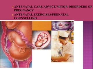 The document discusses antenatal care and advice for pregnant women. It provides definitions for different types of pregnancies and deliveries. It describes the objectives of antenatal care which include maintaining the health of the mother and fetus, screening for complications, and educating mothers. The process involves collecting patient information, examinations, investigations, and providing advice regarding diet, exercise, hygiene and minor disorders that may occur during pregnancy. The overall aim is to deliver a healthy baby and support the goals of the mother.