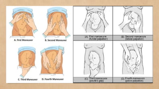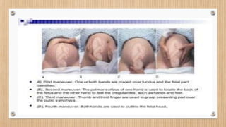 The document provides information on various aspects of antenatal care including its aims, procedures, assessments, and screening for high-risk pregnancies. The main goals of antenatal care are to promote maternal and fetal health by assessing health status, identifying risks, and preventing complications through regular checkups and testing. Key procedures described include taking medical histories, performing physical exams, measuring fetal size and position, and listening for the fetal heartbeat. Screening options help determine risk for issues like birth defects, while tests such as amniocentesis can diagnose genetic conditions. Identifying high-risk factors allows for increased monitoring and intervention if needed.