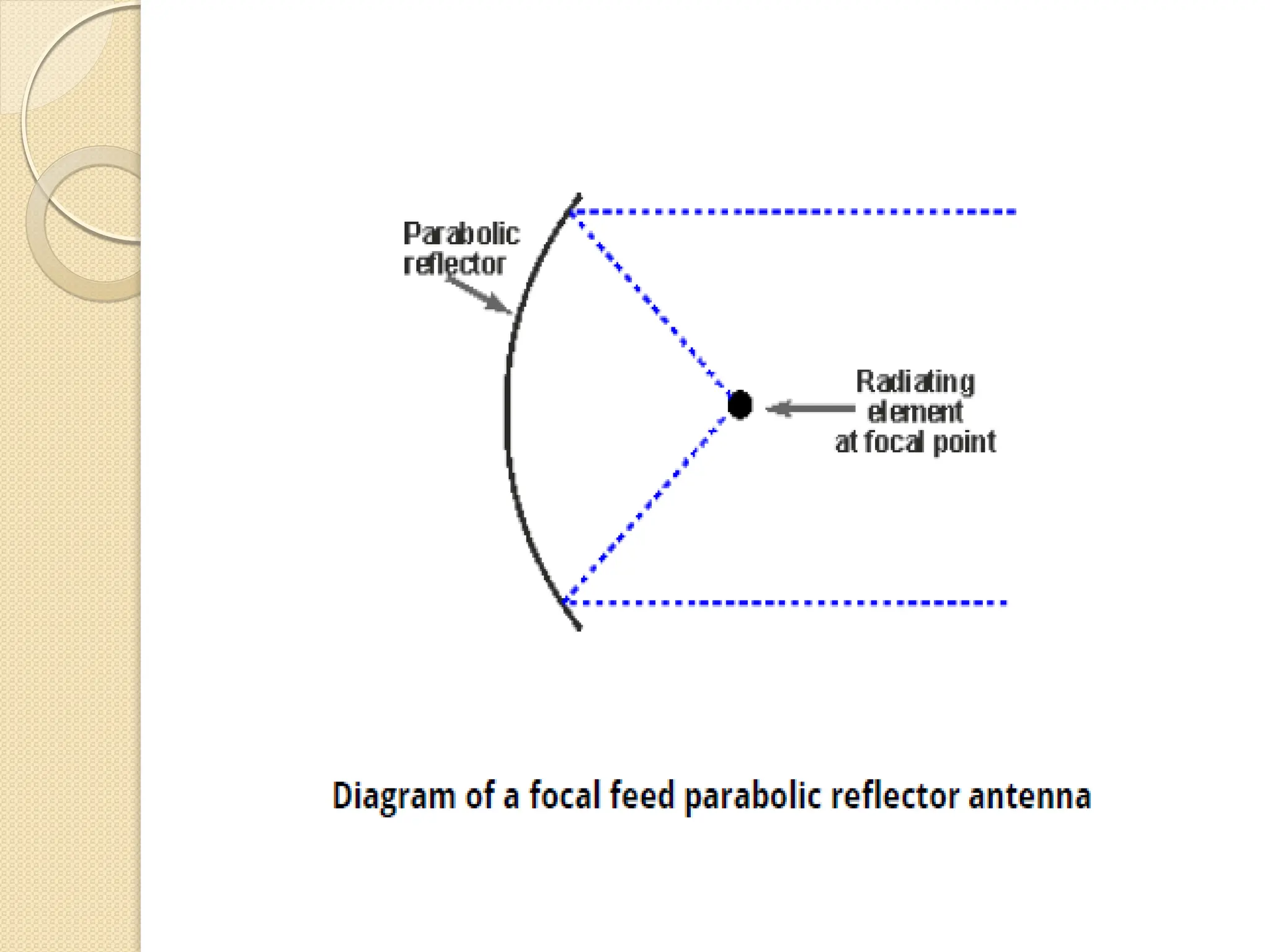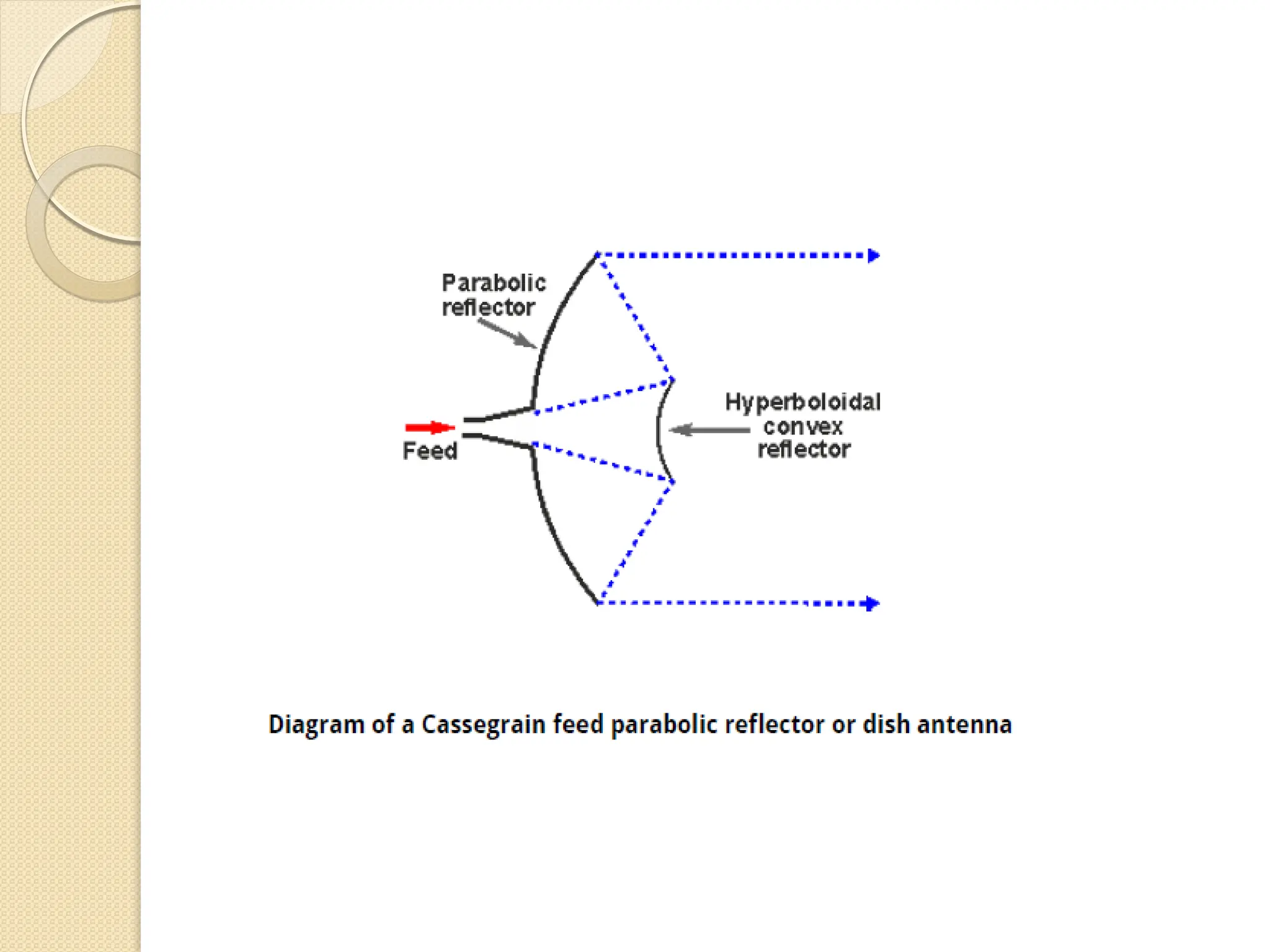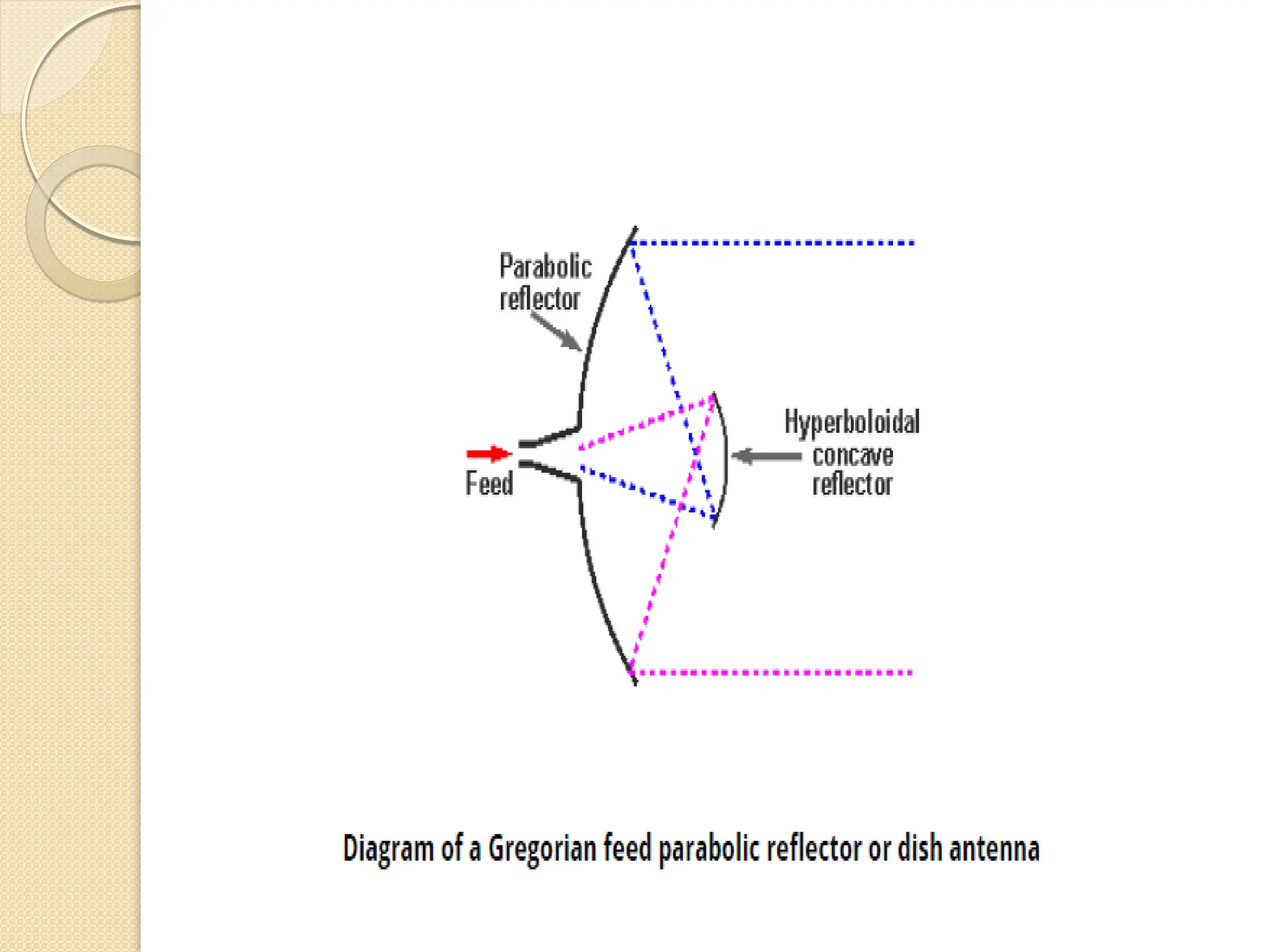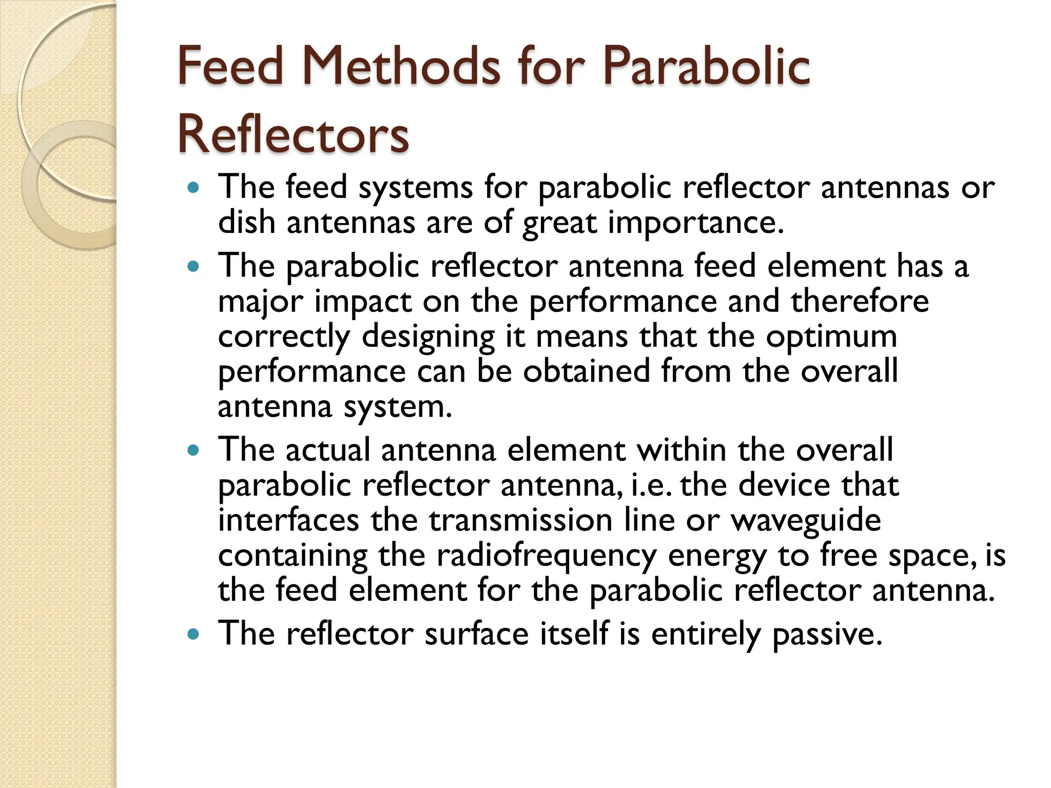 The document discusses the importance of feed systems for parabolic reflector antennas, emphasizing that the design of the feed element significantly affects overall performance. It outlines various types of feed systems, including focal, cassegrain, gregorian, and offset systems, each suited for different applications. Additionally, it describes how radiating elements illuminate the reflector and the challenges associated with achieving optimal performance at different frequencies.
