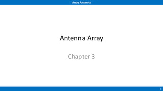 An array antenna uses multiple antenna elements to increase directivity and gain over a single element. It allows controlling the radiation pattern through configuration of elements, their excitation amplitude and phase. A linear array's far-field pattern is determined by its array factor, which is calculated based on number of elements, their spacing and excitation. Common array types include uniform linear arrays and end-fire/broadside arrays. The total pattern is obtained by multiplying the array factor and single element pattern. Arrays find applications in mobile communication base stations, TV reception and more.