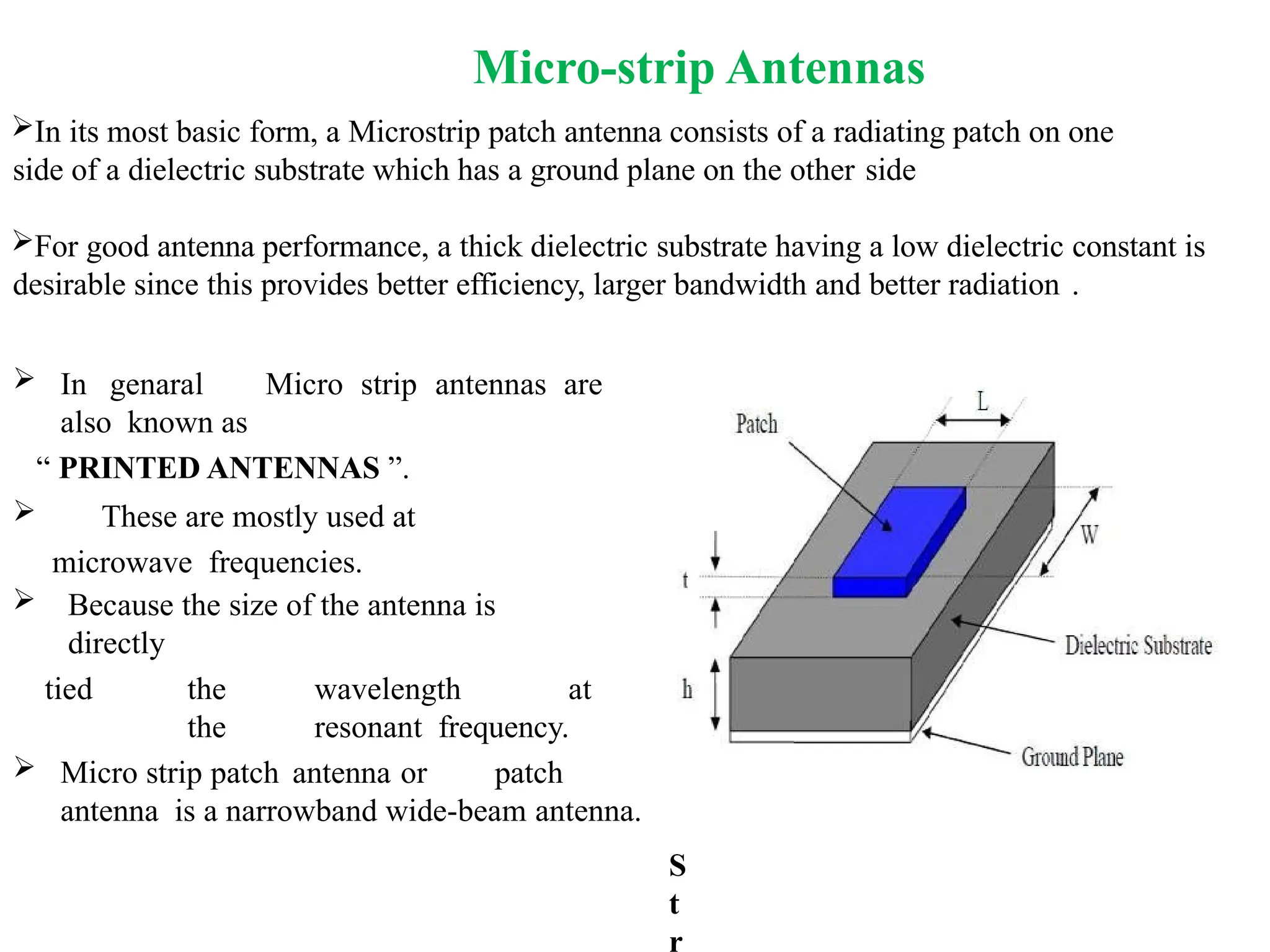 In itsmost basic form, a Microstrip patch antenna consists of a radiating patch on one