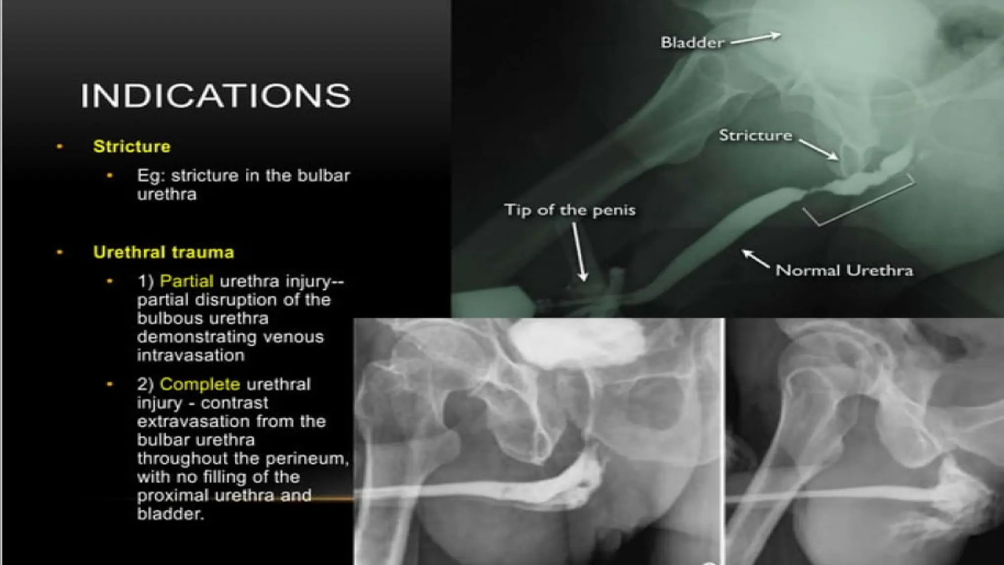 This document outlines the indications and contraindications for imaging urethra using augment imaging techniques, detailing conditions such as strictures and congenital abnormalities, while noting contraindications like acute urinary tract infections. It describes the imaging technique, including patient positioning and catheter insertion, along with specific anatomical features of the anterior and posterior urethra. Potential complications during the procedure, such as urethral trauma and contrast medium intravasation, are also mentioned.