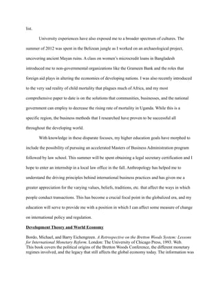 This document provides an annotated bibliography for Cynthia Lewis on topics related to development theory, world economy, consumerism, and trade. It lists 14 academic sources that Cynthia found useful for her research interests, which stem from her background in anthropology with a focus on cultural backgrounds and interests in development theory, economics, business law, and gender differences in business and finance globally. For each source, a brief summary is provided on how the source relates to Cynthia's research areas.