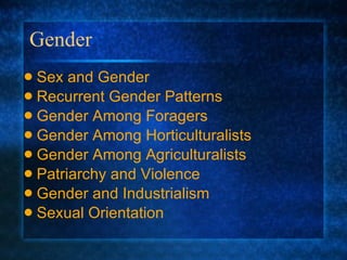 2) Gender roles and the division of labor vary between societies, though foraging societies generally assign hunting to males due to size/strength while some females assist, and horticultural societies range from male-dominated to more equal.