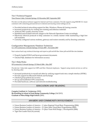 Anthony James is seeking a position as a Software Developer. He has over 10 years of experience developing custom software applications using technologies like VB.NET, Java, C#, SQL, and HTML. As a Software Developer and Systems Administrator for Triple Crown Casinos, he has created various software like promotional kiosks and applications to improve business functions and customer satisfaction. He also maintains the company network and servers.