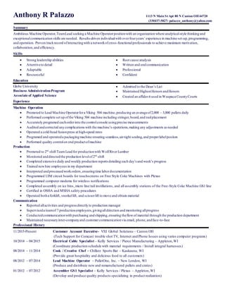 This document is a resume for Anthony Palazzo seeking a machine operator position. Palazzo has over 4 years of experience in machine setup, programming, and operation. He has a proven track record of interacting with others to achieve efficiency and was previously promoted to Lead Machine Operator and 2nd shift Team Lead for production. Palazzo has strong leadership, communication, and problem-solving skills and education in Business Administration.