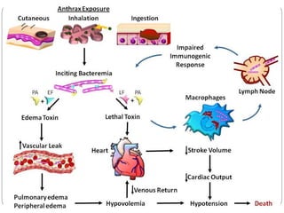 This document describes Bacillus anthracis, the bacterium that causes anthrax. It is a gram-positive, spore-forming bacillus. Anthrax primarily infects herbivores through ingestion, and humans can become infected through contact with infected animals or their products. The bacterium produces an antiphagocytic capsule and lethal toxin. Anthrax infection can occur cutaneously, through inhalation, or gastrointestinal transmission. Treatment involves antibiotics, and vaccines can provide immunity. Control relies on proper disposal of infected carcasses and decontamination of animal products.