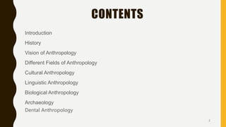 This document provides an overview of the field of anthropology. It discusses the history and evolution of anthropology from its roots in ancient Greek writings to its establishment as a formal academic discipline in the 20th century. The document also outlines several key fields within anthropology, including cultural anthropology, linguistic anthropology, archaeology, and biological anthropology. Each field takes a different approach to understanding human cultures, behaviors, and histories.