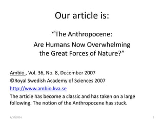 The document provides an overview of an article that introduces the concept of the Anthropocene, a proposed new geological epoch defined by human influence on Earth systems. It summarizes the article's discussion of how human impacts have grown since the Industrial Revolution and accelerated after WWII. The authors assess evidence that human activity is the dominant influence on the planet and consider implications and possible paths forward, including continued growth, mitigation efforts, or geoengineering. They warn that the next few decades will be critical in determining the trajectory of the Anthropocene.