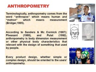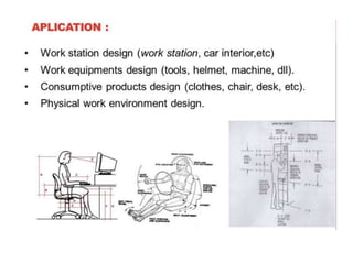 1. Anthropometric data involves measuring the human body, including static dimensions and dynamic functional measurements. This data is used to design workspaces and work surfaces that fit the full range of human body sizes.