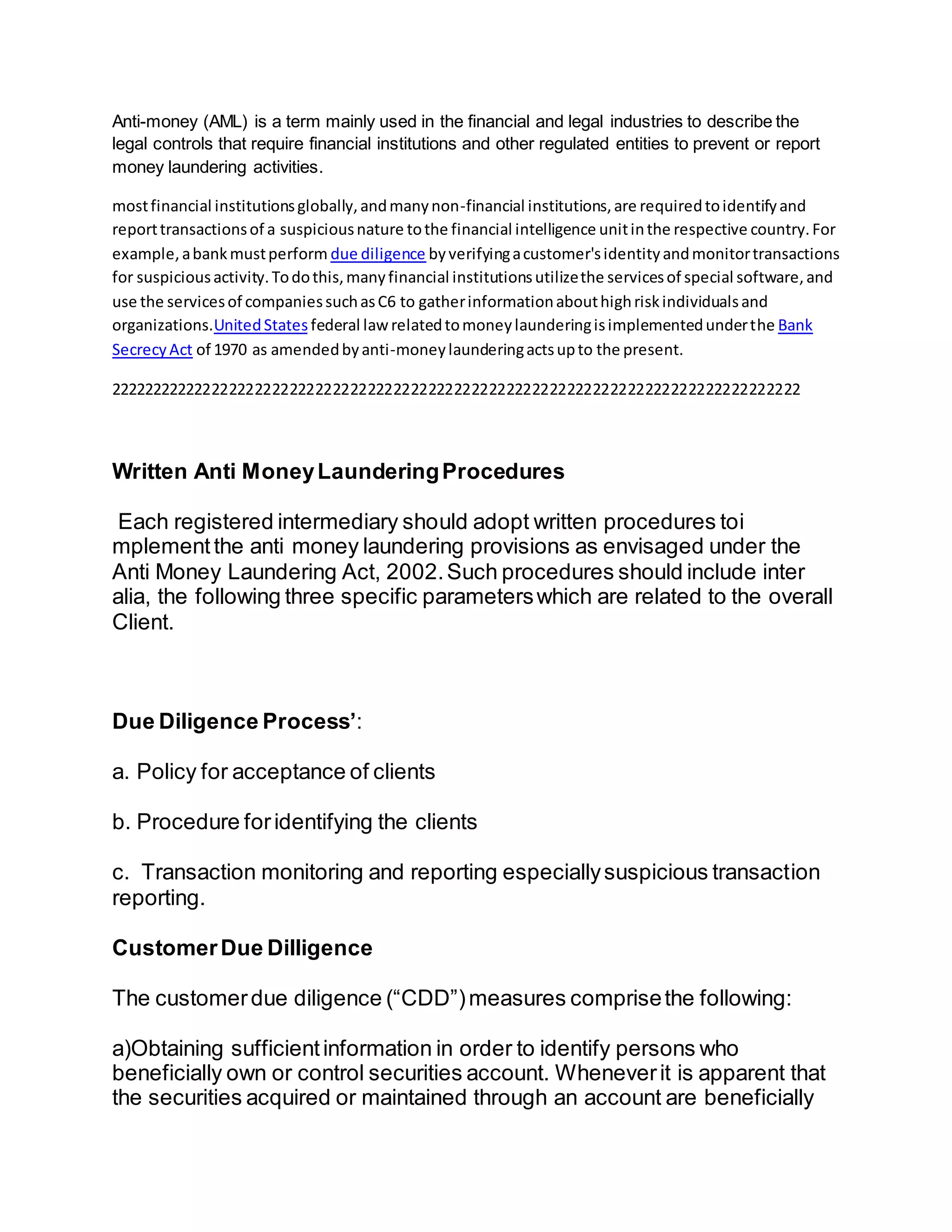 Anti-money laundering (AML) controls require financial institutions to monitor transactions and identify suspicious activity that could be related to money laundering. Most financial institutions must perform customer due diligence to verify identities and monitor transactions, using software and third-party services. United States law related to money laundering is implemented under the Bank Secrecy Act and subsequent amendments. Financial institutions must also have written AML procedures that include policies for customer acceptance, customer identification, and transaction monitoring.