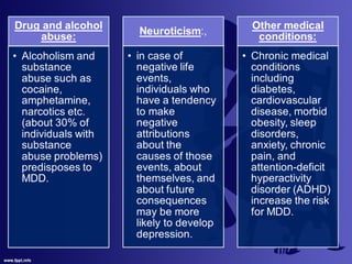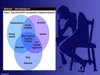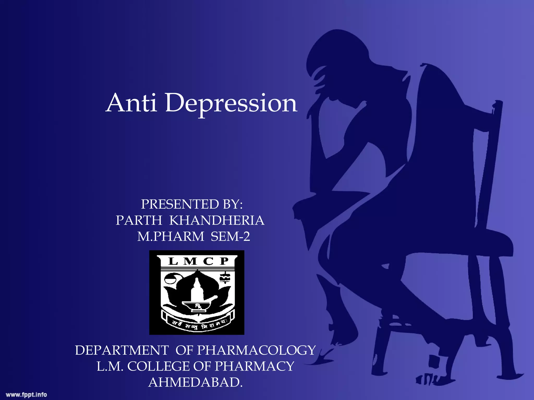 This document provides an overview of anti-depression including definitions, epidemiology, etiology, hypotheses, symptoms, diagnosis, and antidepressants. It defines depression according to the WHO as a common mental disorder characterized by sadness and loss of interest. It notes the lifetime prevalence varies from 3-17% depending on country, and is higher in women. Several hypotheses for the etiology of depression are discussed related to neurotransmitters, receptors, and neuroendocrine factors. Common symptoms and diagnosis criteria from the DSM-V are outlined. Finally, it describes several classes of antidepressants including TCAs, MAOIs, SSRIs, and SNRIs and discusses their mechanisms of action, advantages/disadvantages, side