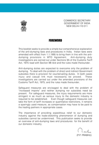 This document provides an overview of India's anti-dumping laws and procedures. It defines key terms like dumping, normal value, export price, and injury. Dumping occurs when an exporter sells a product in India for less than its price in its domestic market. Anti-dumping duties can be imposed if dumping causes material injury to the domestic Indian industry producing like products. The application process and investigation procedures are also summarized.