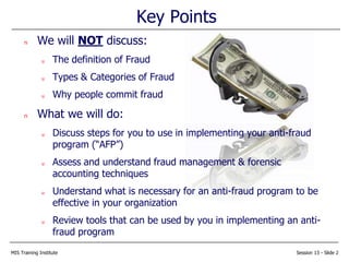 The document outlines strategies for implementing an effective anti-fraud program, including establishing governance, conducting fraud risk assessments, implementing prevention and detection controls, investigating fraud allegations, and taking corrective actions. It discusses benchmarking existing anti-fraud activities, defining roles and responsibilities, identifying key risk categories and schemes, measuring risks, and prioritizing next steps such as obtaining management buy-in and continuously improving prevention and detection efforts. The overall goal is to prevent, detect, and address fraud through a formal, collaborative anti-fraud program.