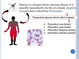This document discusses various antimalarial drugs, classifying them and describing their mechanisms of action, pharmacokinetics, uses, and side effects. It covers quinoline derivatives like chloroquine and amodiaquine, mefloquine, quinine, proguanil, pyrimethamine, sulfadoxine-pyrimethamine, primaquine, artemisinin and its derivatives, atovaquone, and others. The drugs act against different life stages of the malaria parasite in the liver or blood and are used for prophylaxis, treatment, or radical cure of malaria caused by various Plasmodium species.
