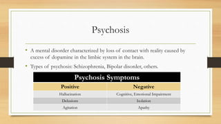 This document discusses anti-psychotic medications. It describes how anti-psychotics work by inhibiting dopamine to treat psychosis symptoms. The document categorizes anti-psychotics as first-generation or typical, and second-generation or atypical. Typical anti-psychotics are further divided into basal and incisive, while atypical anti-psychotics have multi-receptor targets and include multi-acting receptor targeted antagonists, dopamine-serotonin antagonists, dopamine D2-D3 antagonists, and a dopamine partial agonist. The document notes the pharmacokinetics, side effects, and therapeutic strategies for using anti-psychotics.