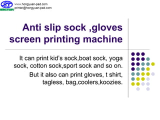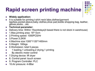 The document describes a rapid screen printing machine capable of printing on various textiles, including socks, gloves, t-shirts, and bags. It provides technical specifications, such as maximum printing area, speed, and operational setup, and highlights its versatility with different logos and clamps. Additionally, it emphasizes the ease of use with essential preparatory materials for printing.