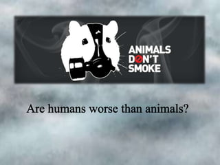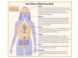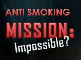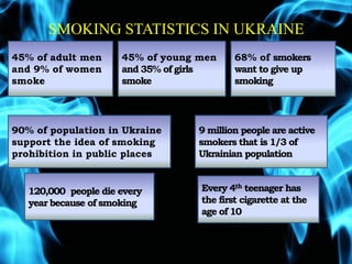 The document provides statistics on smoking rates in Ukraine and worldwide. In Ukraine, 45% of adult men and 9% of women smoke, as do 45% of young men and 35% of girls. 68% of smokers in Ukraine want to quit. Worldwide, 2 billion people smoke, smoking causes 3 million deaths annually, and 62 million people have died from smoking since 1950. The document urges people not to start smoking for health reasons.