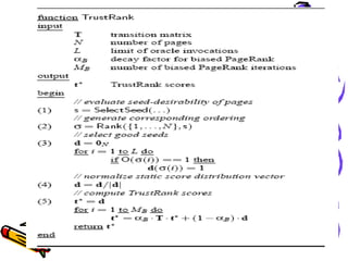 The document discusses algorithms for combating web spam, including TrustRank and Hilltop. TrustRank computes a static trust score for pages based on the trustworthiness of inbound links. Hilltop identifies expert pages on a topic and ranks target pages based on links from relevant experts. It detects expert pages by those that link to many distinct, non-affiliated pages on a topic. Target scores reflect links from relevant experts and key phrases in those links. The algorithms are evaluated based on precision, recall, and pairwise ordering of results.