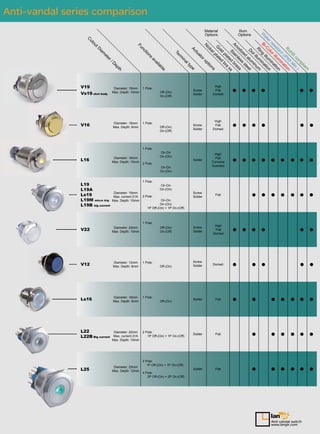 This document provides information on anti-vandal switches from Langir Electric Co. including: