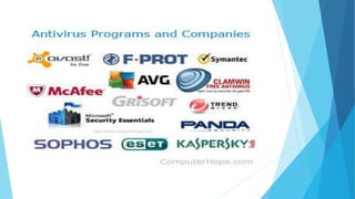 This document provides information about computer viruses and antivirus software. It defines viruses as small programs that spread from computer to computer and interfere with operations. It explains that viruses are often spread through email attachments and downloads. The document then discusses different types of viruses and what to do if a computer has a virus. It defines antivirus software as programs that identify and eliminate viruses. It describes how antivirus software works by maintaining databases of known viruses and scanning files to detect matches. It also explains how antivirus software intercepts files, disinfects infected files, and alerts users. The document provides tips on installing, updating, and using antivirus software effectively.