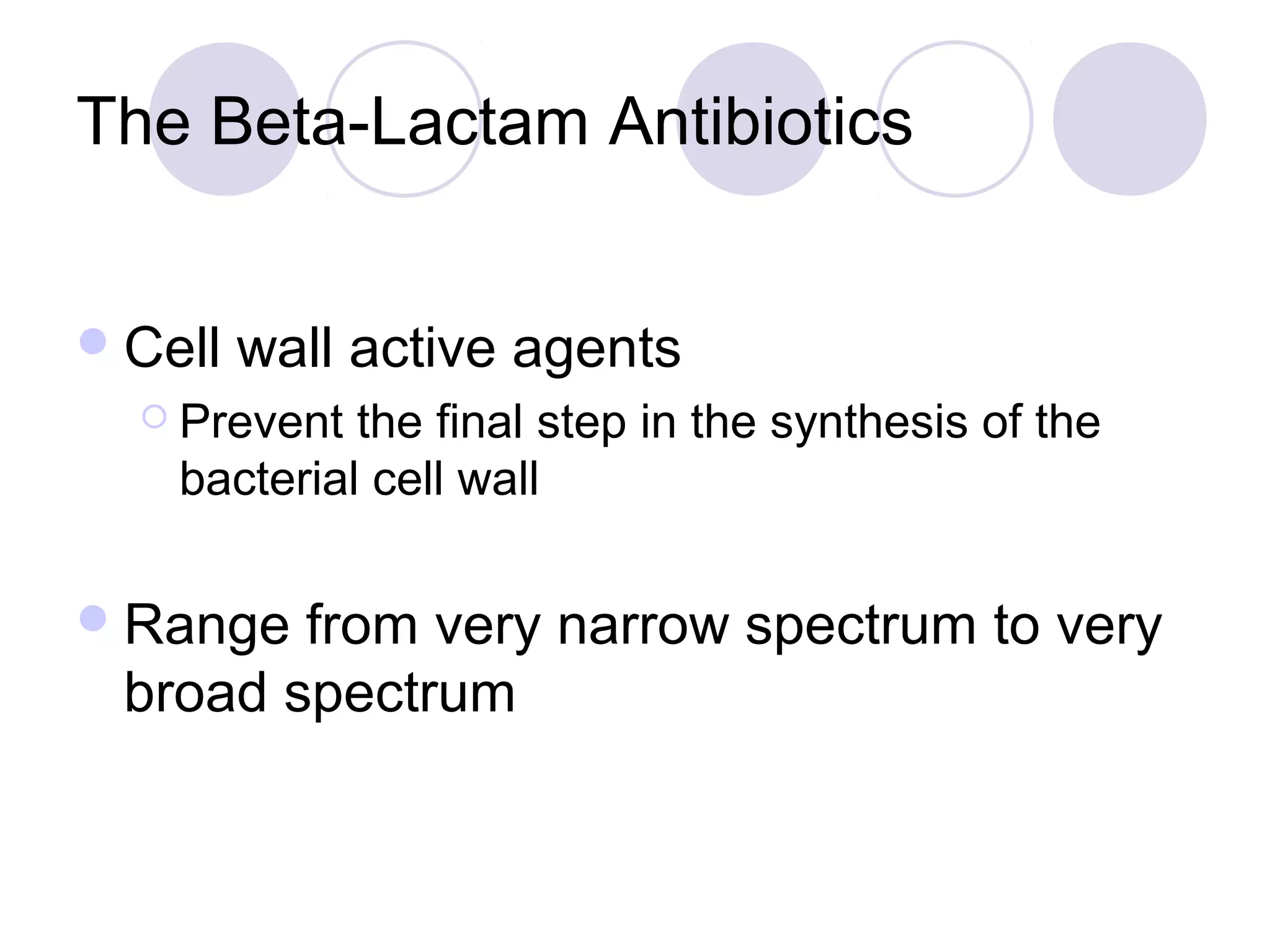 The document provides an overview of beta-lactam antibiotics, which are cell wall active agents that prevent bacterial cell wall synthesis and range from narrow to broad spectrum. It details their mechanisms of action, classifications (including penicillins and cephalosporins), and considerations for selection based on resistance and infection type. Adverse reactions, pharmacokinetics, and strategies for overcoming beta-lactamase resistance are also discussed.