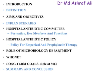 The document outlines the necessity of implementing a stringent antibiotic policy in hospitals to combat the rise of antibiotic resistance due to misuse and inappropriate prescriptions. It emphasizes the formation and roles of a Hospital Antibiotic Committee, guidelines for empirical and prophylactic antibiotic administration, and the importance of microbiology departments in infection control. Additionally, it calls for enhanced education for medical professionals and adherence to established protocols to ensure responsible antibiotic use in India.