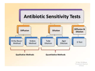 Antimicrobial susceptibility testing (AST) determines the resistance of microorganisms to antimicrobial agents. There are several methods for AST including disk diffusion, dilution methods, and E tests. Guidelines for AST are provided by CLSI and EUCAST. Mueller Hinton agar is the recommended medium for testing and inoculum preparation follows the 0.5 McFarland standard. Quality control using standard reference strains is important to ensure accurate and reproducible AST results.