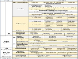 The document defines antibiotics as substances that destroy or inhibit the growth of bacteria and are used to treat infections. It discusses the classification and types of bacteria, including Gram-positive and Gram-negative, and how antibiotics work by inhibiting bacterial cell functions or killing bacteria. The document also provides lists of common infections treated with antibiotics, examples of generic and brand name antibiotics, and discusses antibiotic resistance and anti-infective drugs.