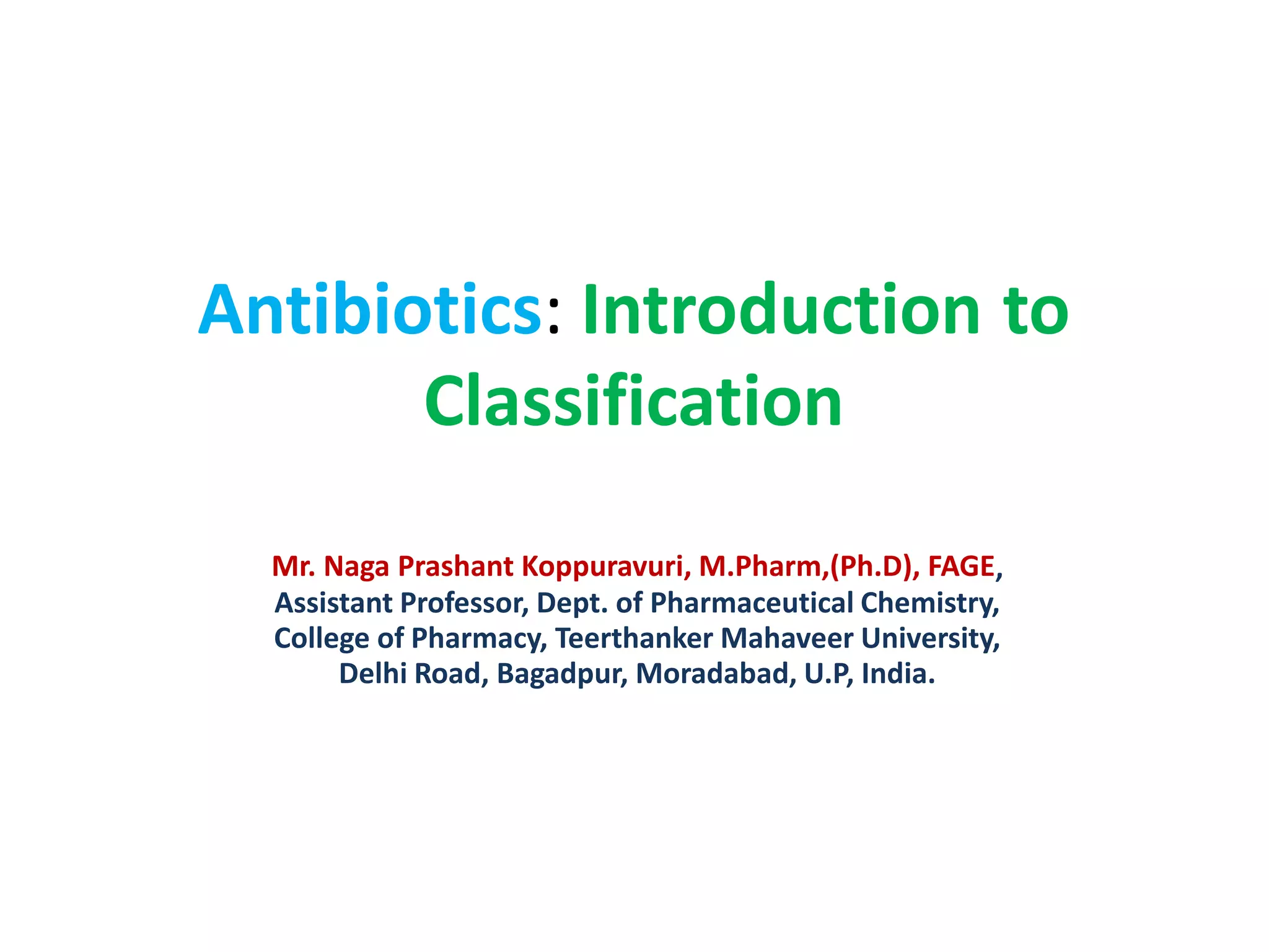 1. Antibiotics can be classified based on their chemical structure or mechanism of action. Major classes include beta-lactams, quinolones, sulfonamides, and glycopeptides.