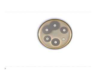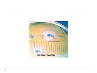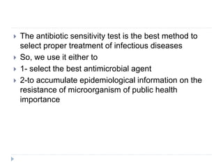 The document discusses various methods for antibiotic sensitivity testing, including Kirby Bauer disk diffusion, comparative methods, dilution methods, and Epsiloid tests. The Kirby Bauer method involves placing antibiotic disks on an inoculated agar plate and measuring inhibition zones. The comparative method compares inhibition zones to a control, classifying sensitivity as sensitive, intermediate, or resistant. Dilution methods detect the minimum inhibitory concentration by making serial dilutions of antibiotics and observing bacterial growth. Epsiloid tests also detect minimum inhibitory concentrations using plastic strips containing exponential gradients of antibiotics.
