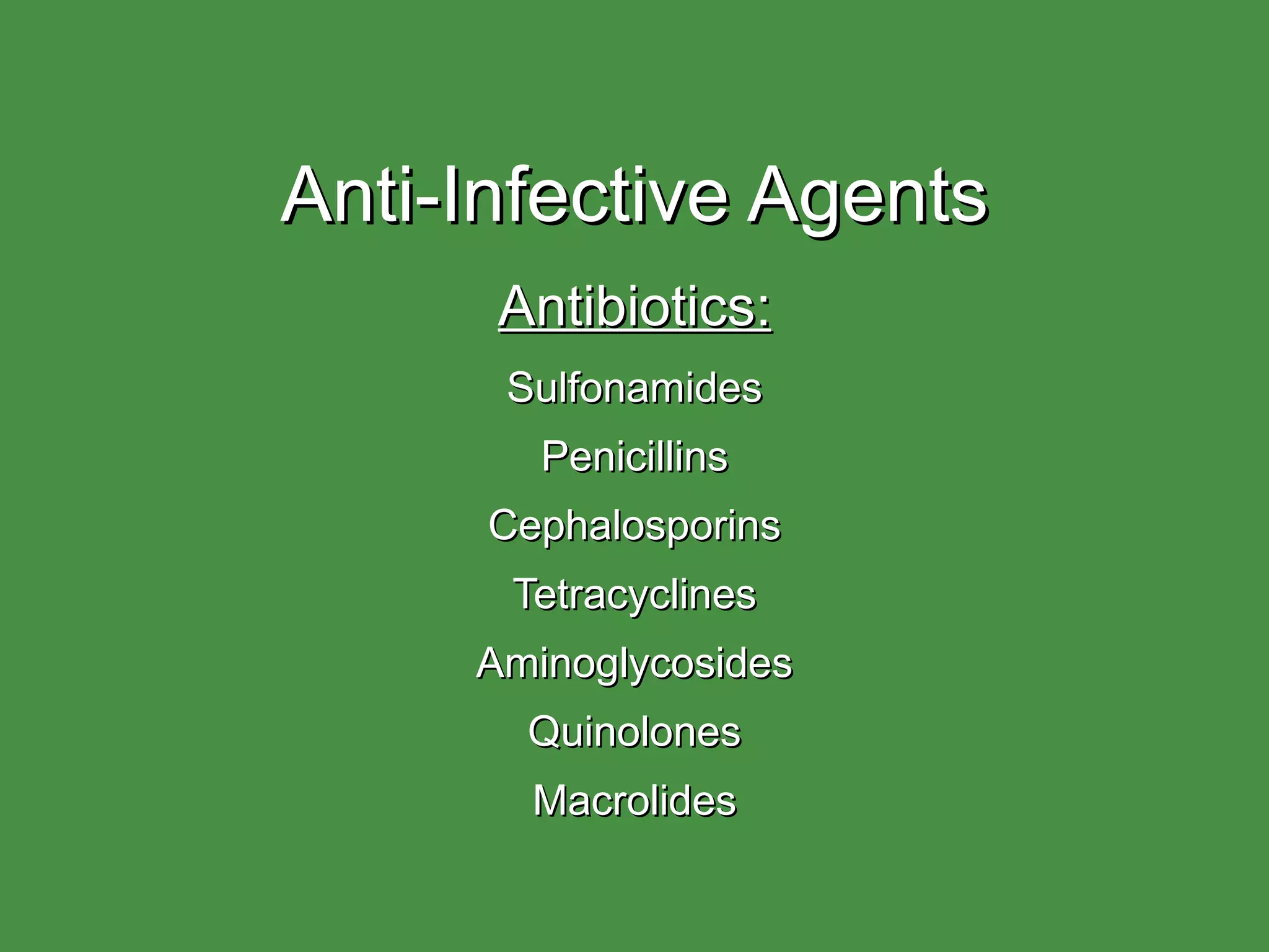 This document provides an overview of various classes of anti-infective agents (antibiotics) including their mechanisms of action, therapeutic uses, and side effects. It discusses sulfonamides, penicillins, cephalosporins, tetracyclines, aminoglycosides, quinolones, and macrolides. Nursing implications for each class focus on monitoring for effectiveness and potential adverse drug reactions.