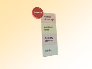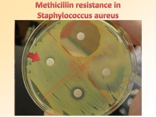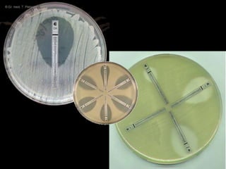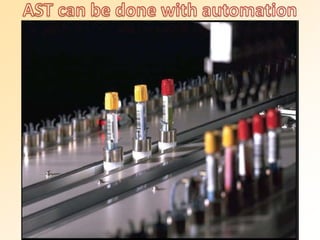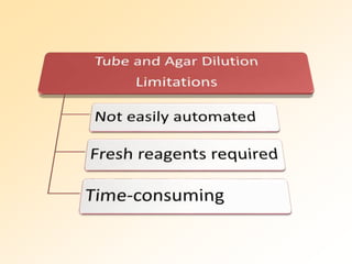 This document discusses antibiotic sensitivity testing (AST), which determines which antibiotics will effectively treat a bacterial infection. AST involves growing bacteria in culture with different antibiotics to see which ones inhibit growth. This helps clinicians select the most effective antibiotic for a patient. Common AST methods include disk diffusion, dilution tests, and automated systems. Care must be taken to standardize test conditions for reliable results. AST also provides epidemiological data on antibiotic resistance trends in a community.