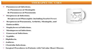 Antibiotics are chemical compounds produced by microorganisms that kill or inhibit the growth of other microorganisms at low concentrations. They are classified based on their chemical structure and include beta-lactam antibiotics like penicillins, cephalosporins, and monobactams. Penicillins work by inhibiting the bacterial enzyme transpeptidase which is involved in cell wall synthesis, becoming covalently linked to the enzyme's active site and causing irreversible inhibition. Common penicillins include penicillin G, penicillin V, ampicillin, amoxicillin, and methicillin.
