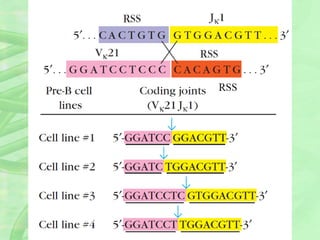 The document discusses the generation of antibody diversity in the immune system. It explains that there are millions of possible antigens but only a small number of immunoglobulin genes in our genome. Through seven mechanisms, including multiple germline genes, combinatorial V(D)J joining, junctional flexibility, and somatic hypermutation, the immune system is able to generate a diverse repertoire of antibodies against all potential antigens from a limited set of gene segments. These mechanisms operate during B cell development and maturation in the bone marrow and lymphoid tissues.