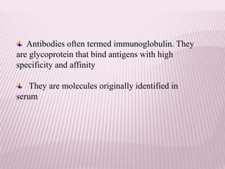 Antibodies can be engineered using genetic techniques to alter their properties for therapeutic applications. Key characteristics that can be modified include immunogenicity, effector function, size and affinity. Techniques like generating chimeric or humanized antibodies can reduce immunogenicity. The effector function can be enhanced or reduced depending on the intended use of the antibody. Size can be decreased by removing nonessential components. Affinity can be increased by altering amino acids in the binding site. Antibody engineering also includes techniques like phage display which can be used to isolate antibodies with desired properties.