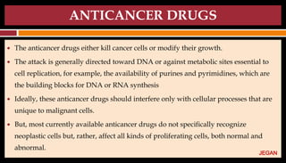 The document provides an overview of anticancer drugs, categorizing them into cytotoxic, targeted, and hormonal drugs. It details various classes of cytotoxic agents, including alkylating agents, microtubule inhibitors, and antimetabolites, highlighting their mechanisms of action and specific drug examples. Additionally, it addresses side effects, mechanisms of resistance, and specific indications for different anticancer therapies.
